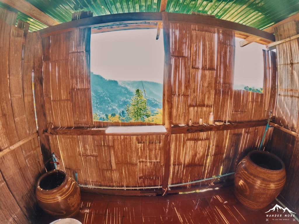 ‘สุขาวิวสวรรค์’ ห้องน้ำที่นี่จะเป็นแนว Open Air คือผนังไม้ไผ่สาน วิวก็ตามในภาพนี้เลยค่า ลองนึกภาพดูว่าหลังจากกลับมาจากเดินขึ้นผาสามเหลี่ยมเหนื่อยๆ แค่ได้ตักน้ำจากโอ่งมาราดตัวก็สบายสุดๆ แล้ว (แต่ถ้าเป็นหน้าหนาวนี่มีสั่นแน่ๆ ค่ะ 555+ ^^)