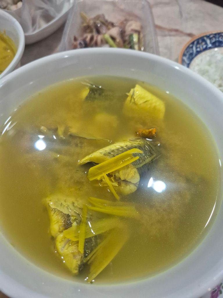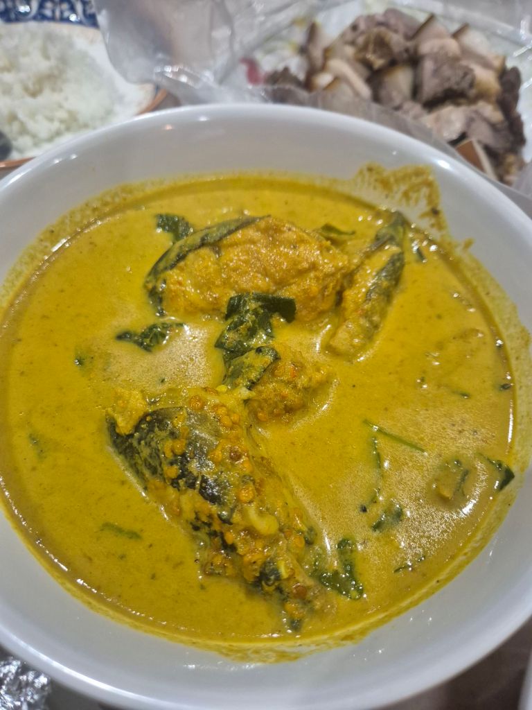พอเอ่ยชื่อ พระรามลงสรง ตอนแรกก็นึกไม่ออกว่ามันคืออะไร ป๊าเลยบอกว่า มันคือเมนูที่เอาผักบุ้งลวก และหมูลวก ราดน้ำกะทิ โปะด้วยน้ำพริกเผา เป็นเมนูที่หาทานได้ยาก เวลาทานก็แนะนำให้ปรุงเหมือนตอนปรุงก๋วยเตี๋ยวเลยนะ เพื่อเพิ่มรสชาติ เพราะเมนูนี้จะจืดโดยตัวของมันเองอยู่แล้ว